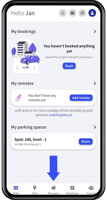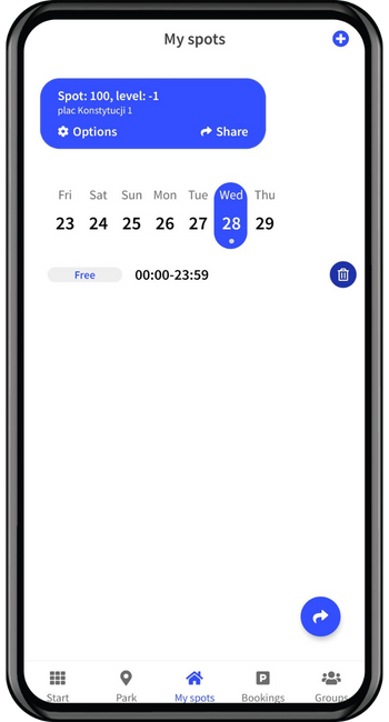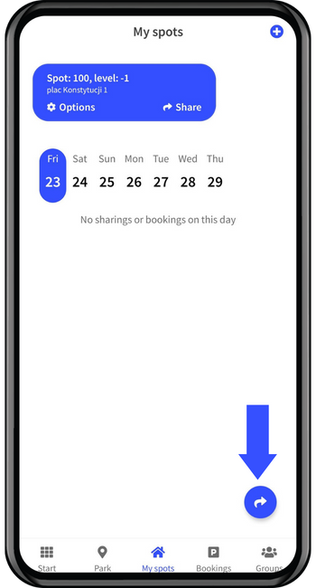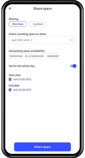 2. Specify the rules of sharing: you can share a parking spot once (e.g. one day) or cyclically (e.g. every Friday), then fill in the day and time when you want to share your spot with another person. Confirm your choice by clicking "Share spot".