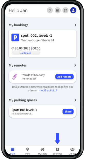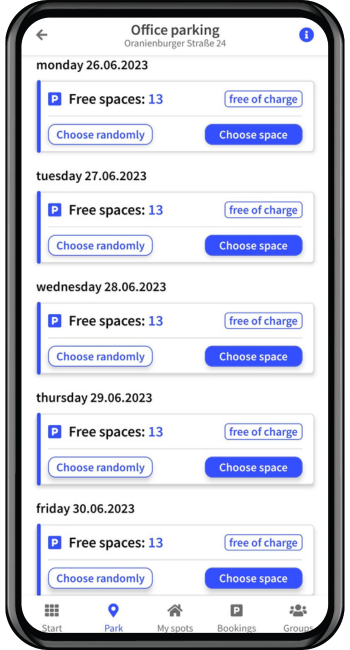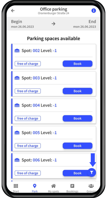 2. Select the day you want to park and the parking spot. You can also select a random parking spot that will be available on that day. Then you will immediately proceed to confirm your reservation. By clicking on the blue icon, you can filter parking spots by level and sector. Next, confirm your parking details.