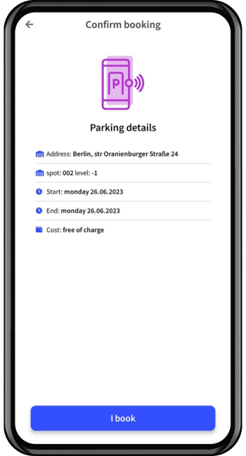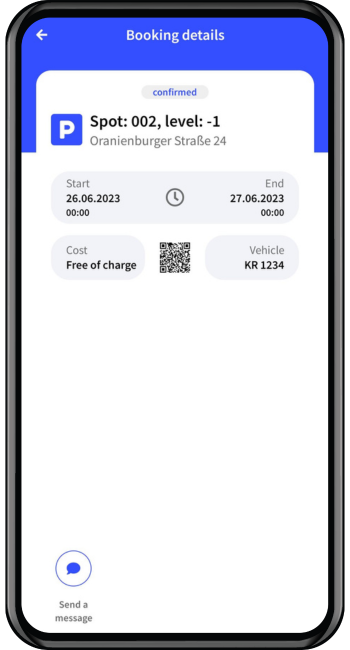 5. Once the seat is reserved, you will receive the details of the reservation. The reserved spot will also appear on the main screen of the app. Buttons to open entry/exit will appear on the day of booking.