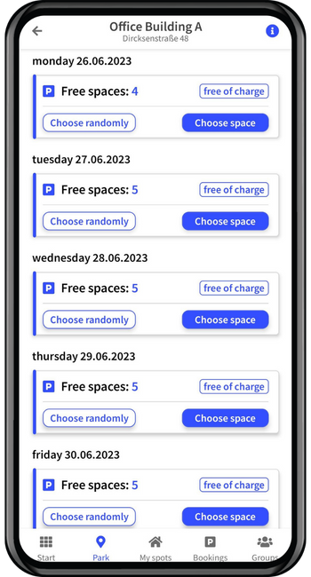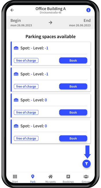 2. Select the day you want to park and the parking spot. You can also select a random parking spot that will be available on that day. Then you will immediately proceed to confirm your reservation. By clicking on the blue icon, you can filter parking spots by level and sector. Next, confirm your parking details.