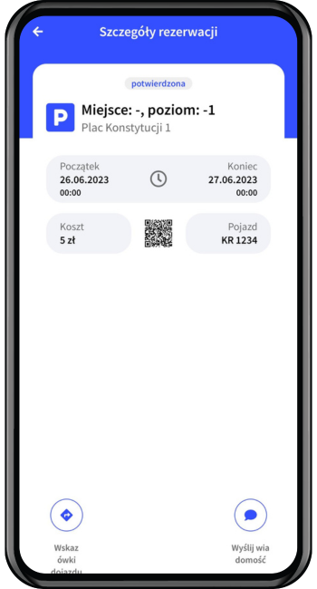 5. Po zarezerwowaniu miejsca otrzymasz szczegóły rezerwacji. Zarezerwowane miejsce pojawi się również na ekranie głównym aplikacji. Pprzyciski do otwarcia szlabanów/bram pojawią się w dniu rezerwacji.